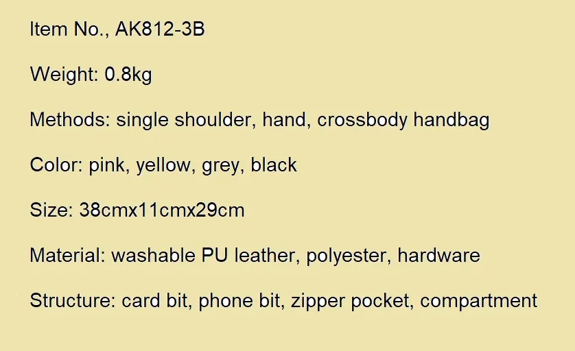 SPECIFICATIONSApplicable Season: Four SeasonsBrand Name: Angel kissCN: GuangdongClosure Type: ZipperDecoration: NoneExterior: NoneGender: WomenHandbags Type: Shoulder BagsHardness: SOFTHigh-concerned chemical: NoneInterior: Interior Slot Pocket,Cell Phone Pocket,Interior Zipper PocketLining Material: POLYESTERMain Material: PUModel Number:...