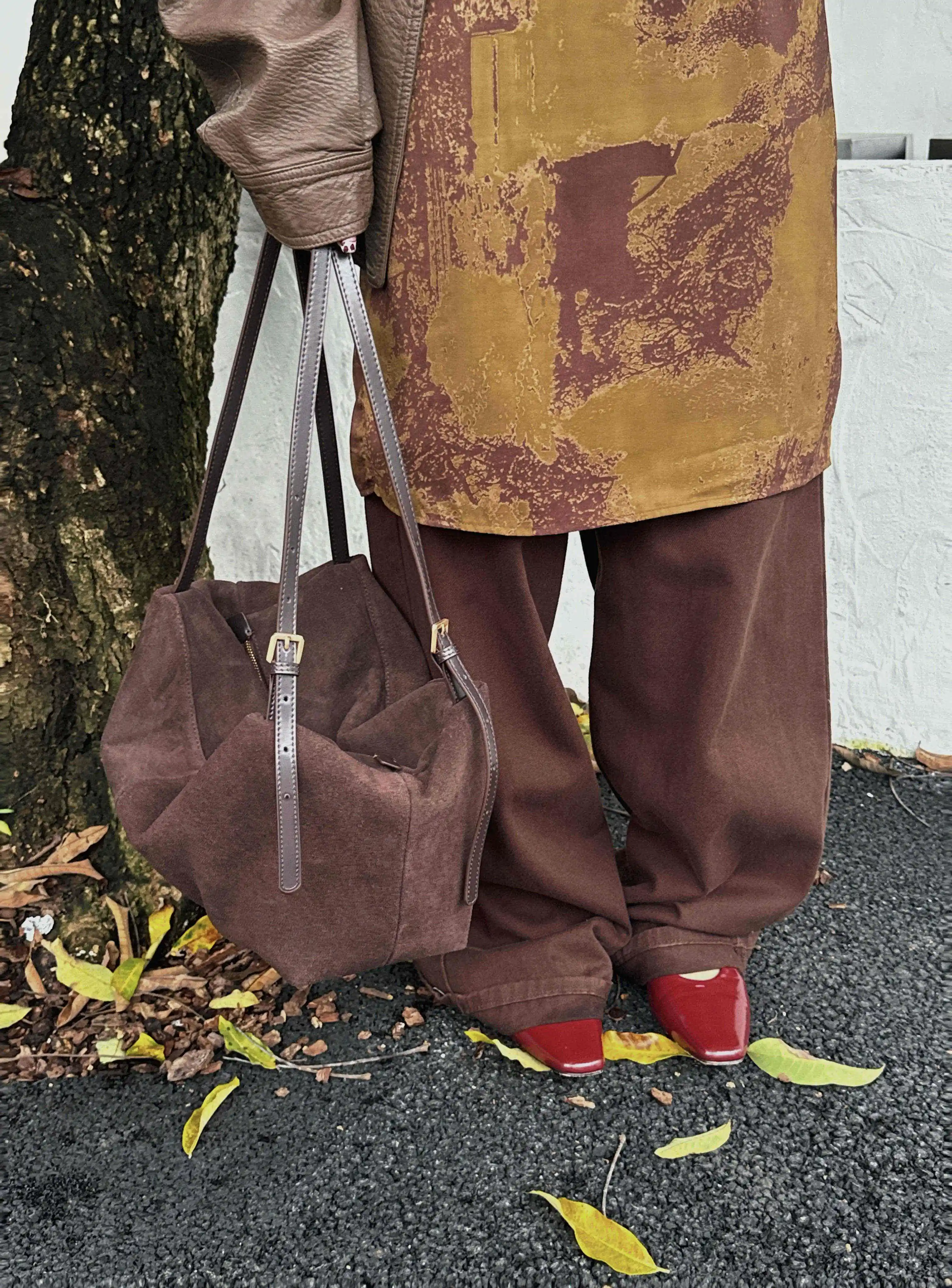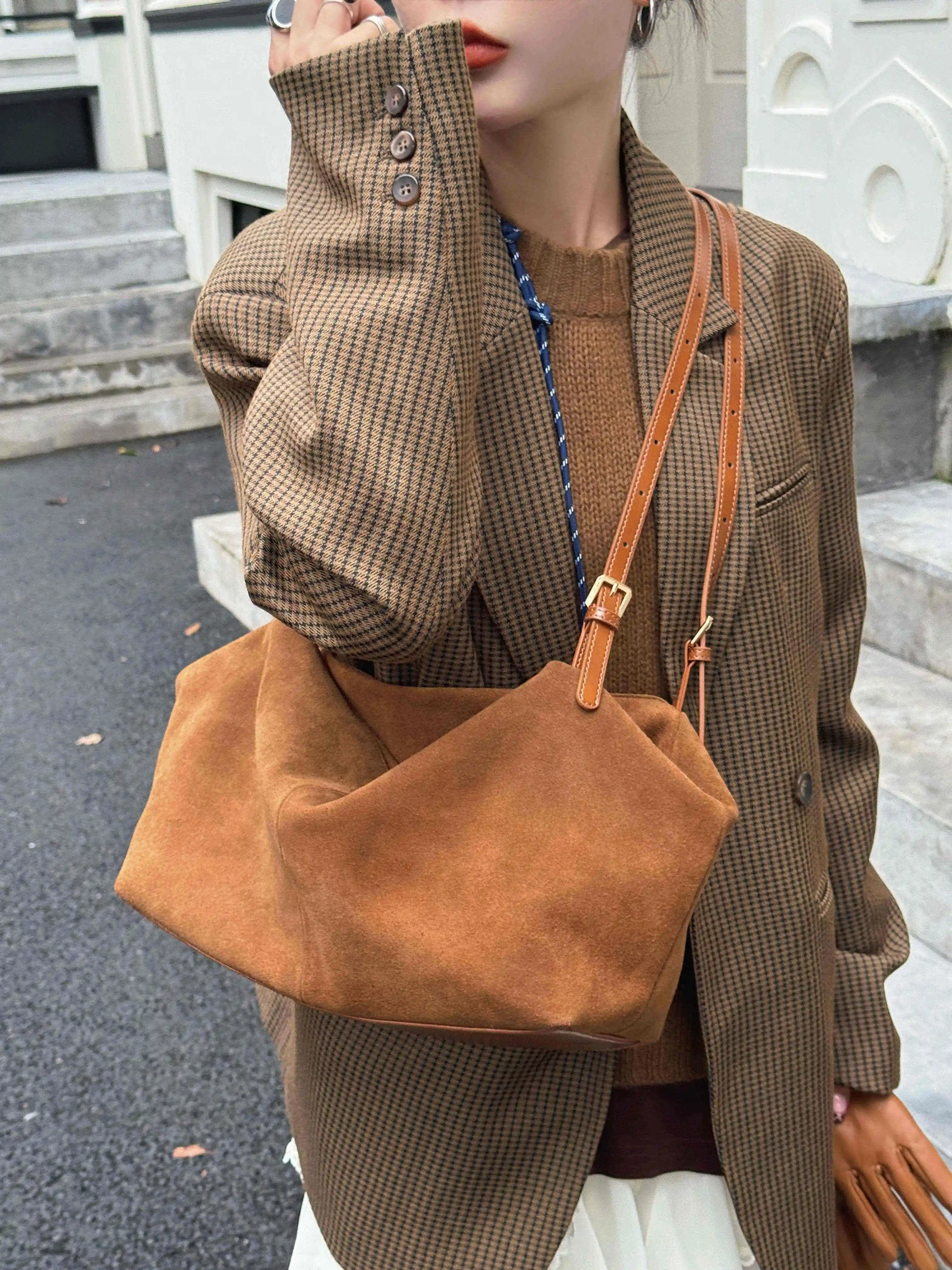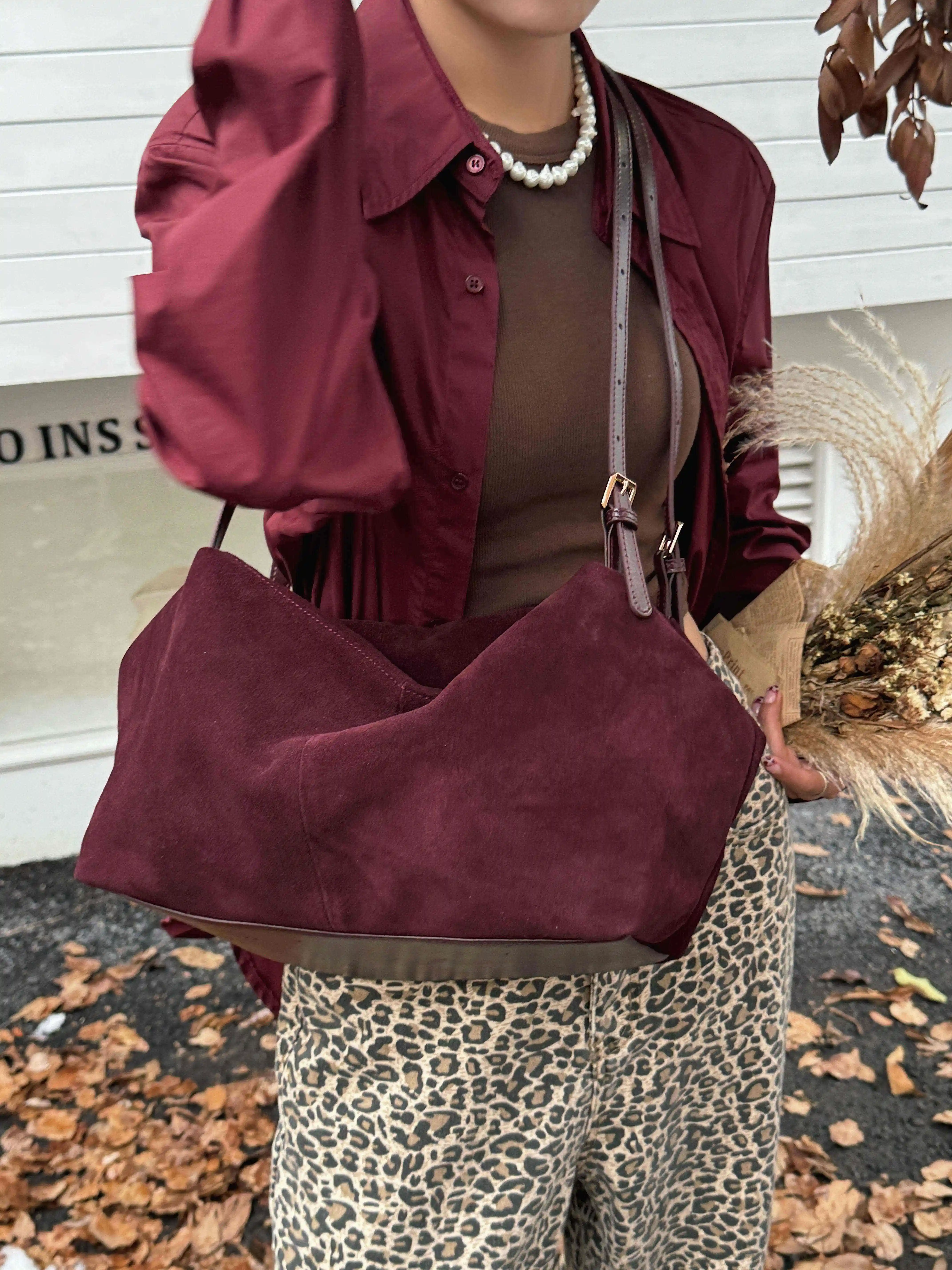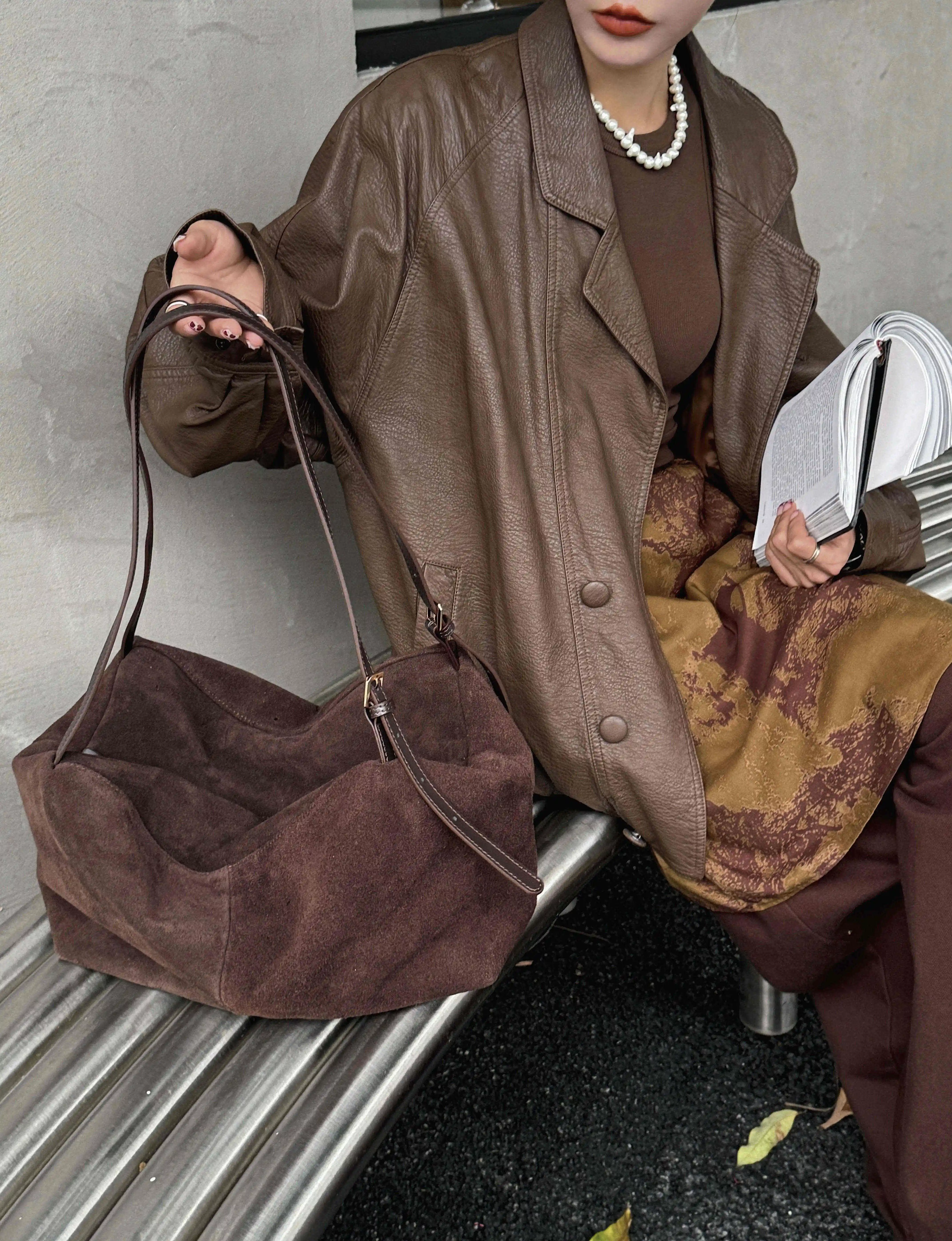 Motingsome Natural Suede Leather Women Boston Bags Roomy Pillow Tote Luxury Matte Cowhide Bag 2024 New Crossbody Retro Tote