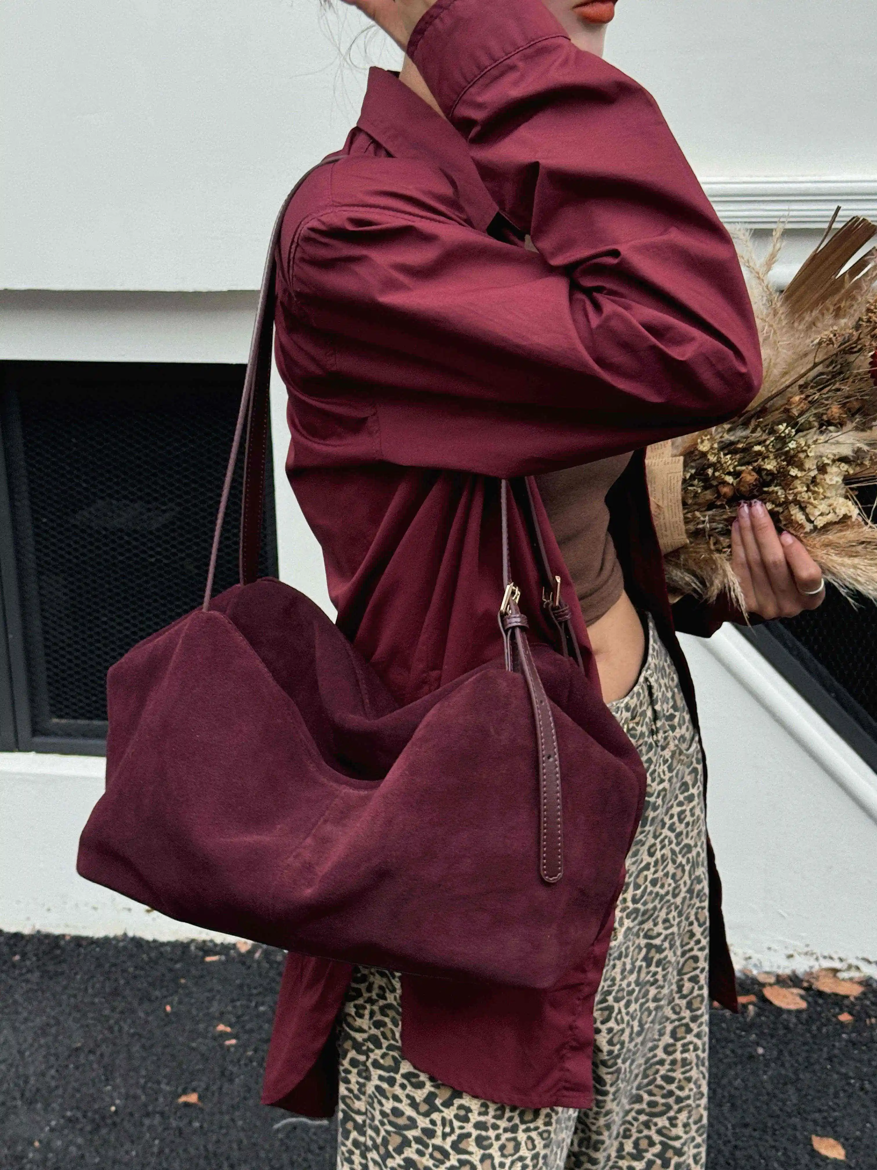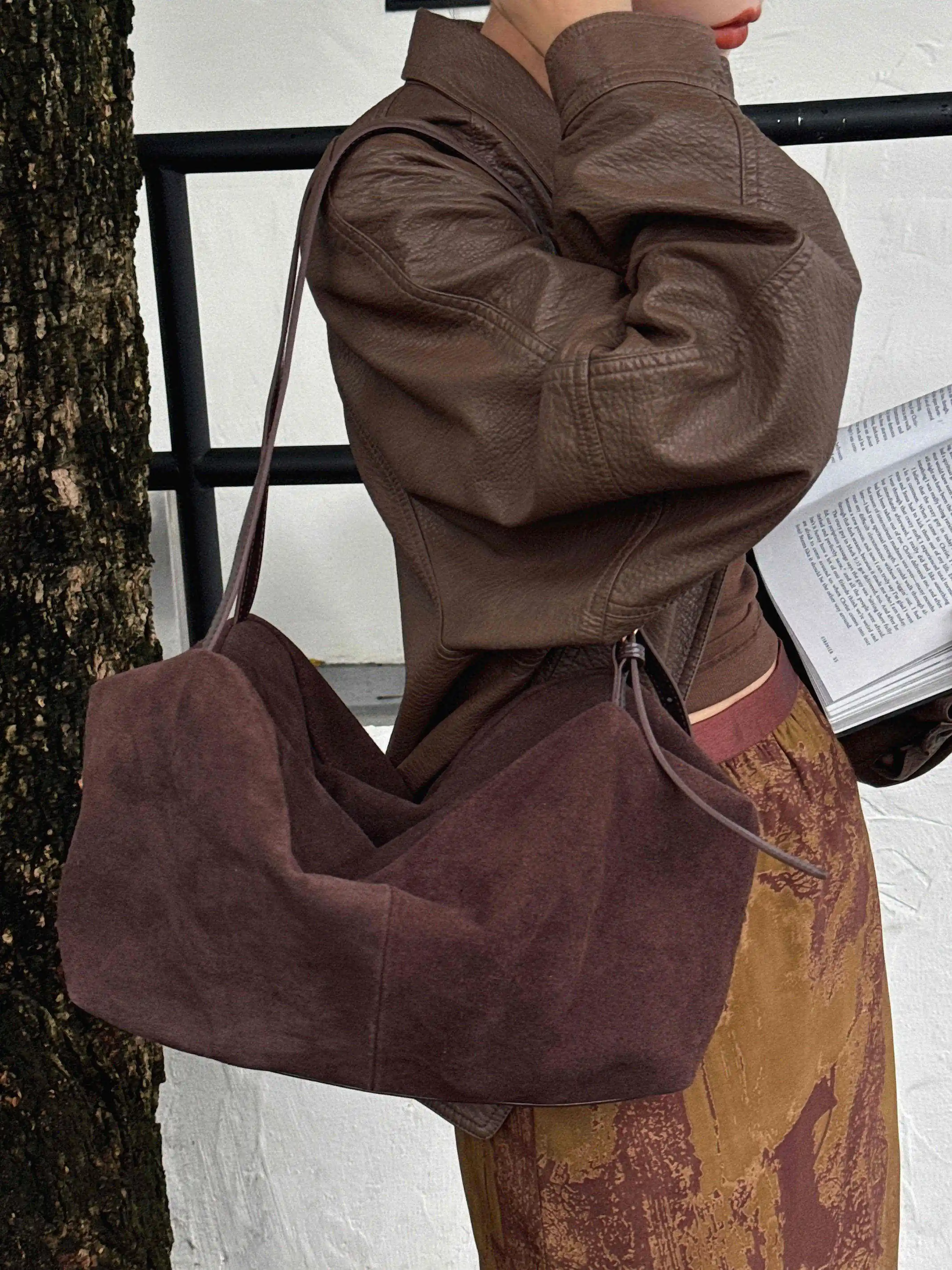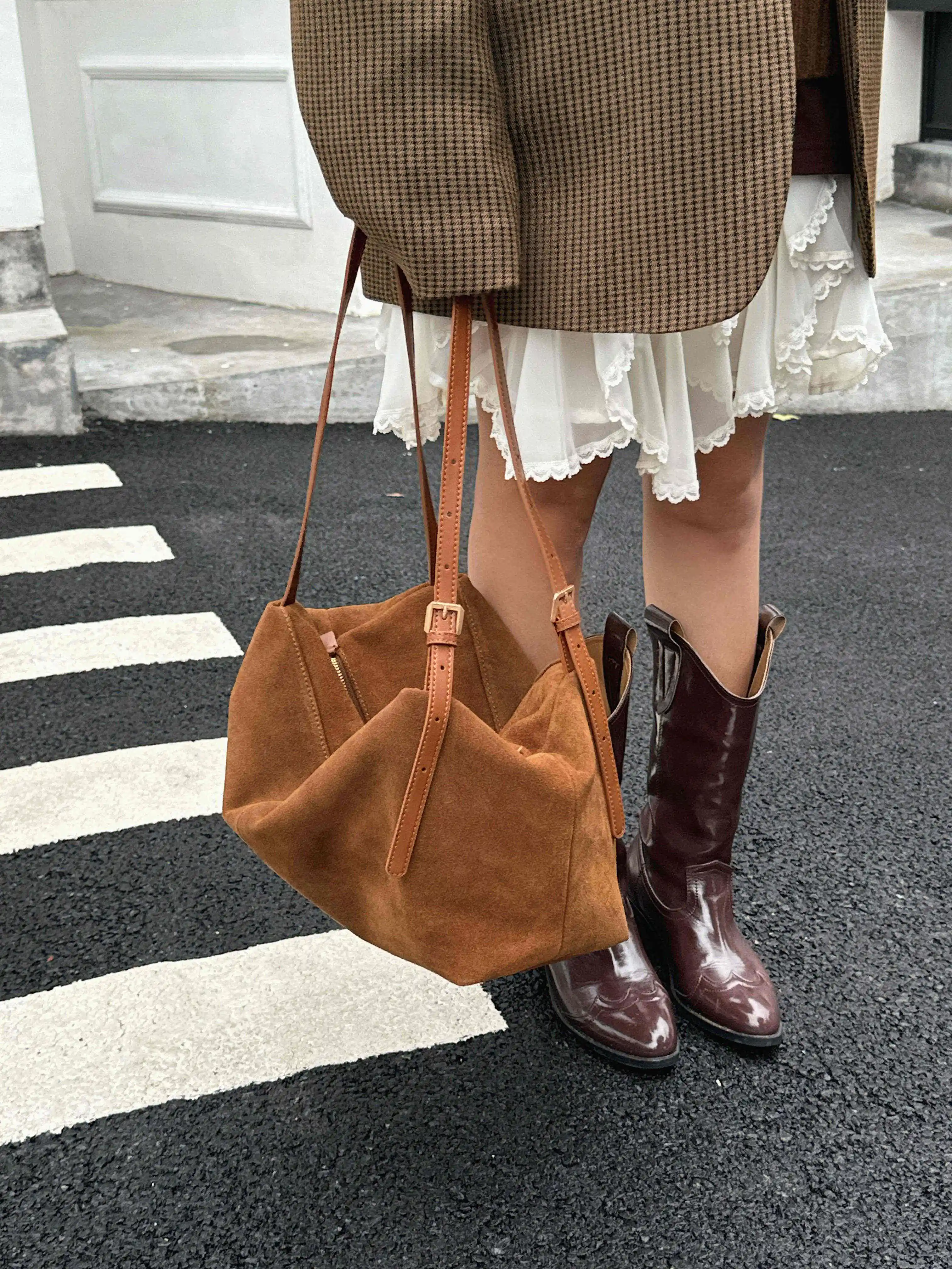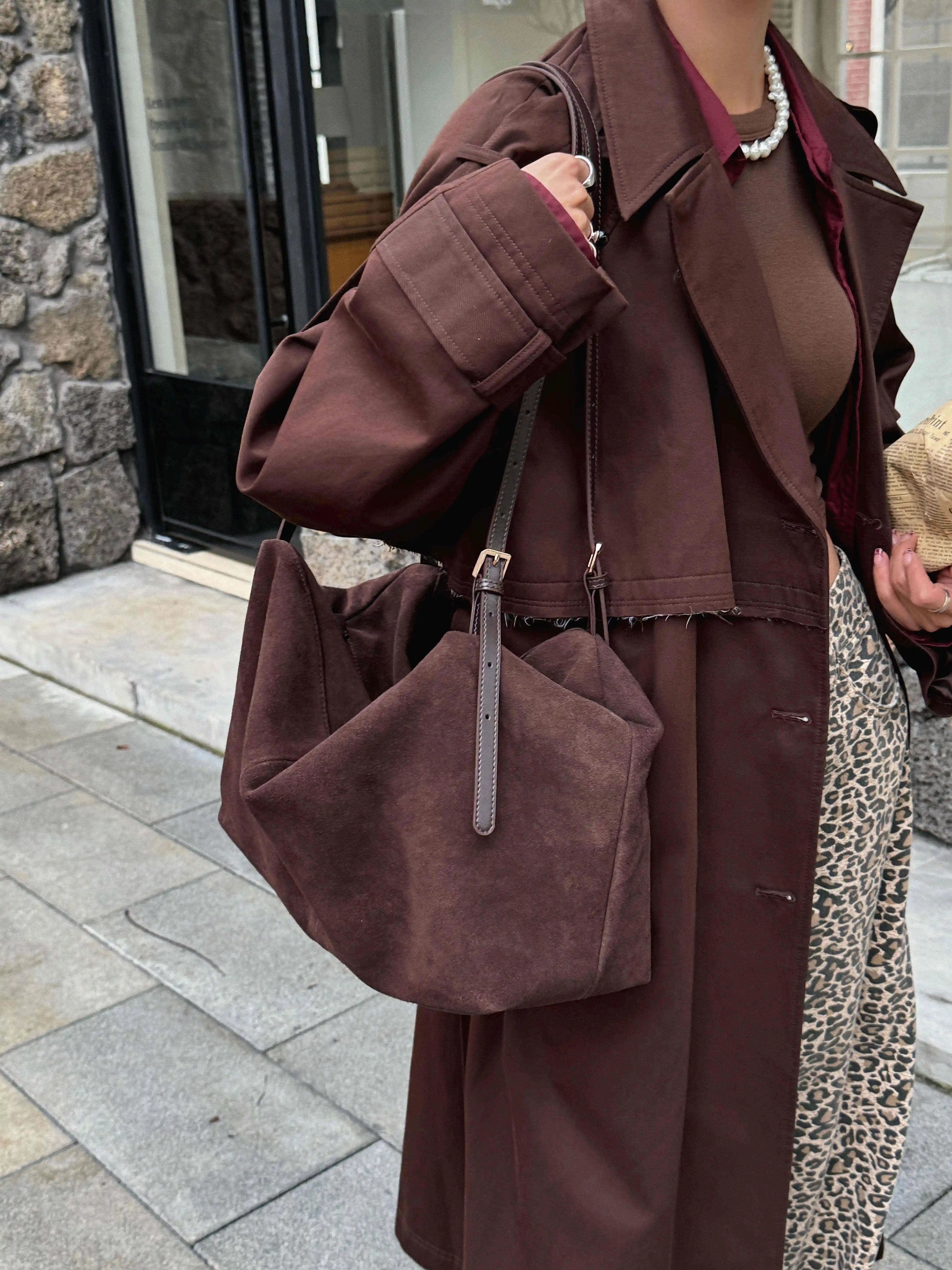 Motingsome Natural Suede Leather Women Boston Bags Roomy Pillow Tote Luxury Matte Cowhide Bag 2024 New Crossbody Retro Tote