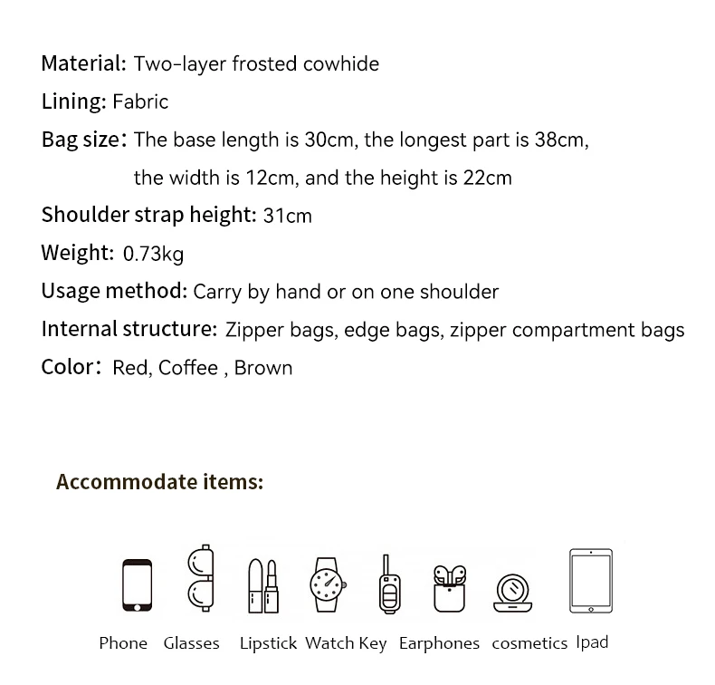 SPECIFICATIONSApplicable Season: Autumn And WinterBrand Name: NoEnName_NullCN: GuangdongChoice: yesClosure Type: HaspExterior: NoneGender: WomenGenuine Leather Type: Cow LeatherHandbags Type: Shoulder BagsHardness: SOFTHigh-concerned chemical: NoneInterior: Interior Slot Pocket,Cell Phone Pocket,Interior Zipper PocketLining Material:...