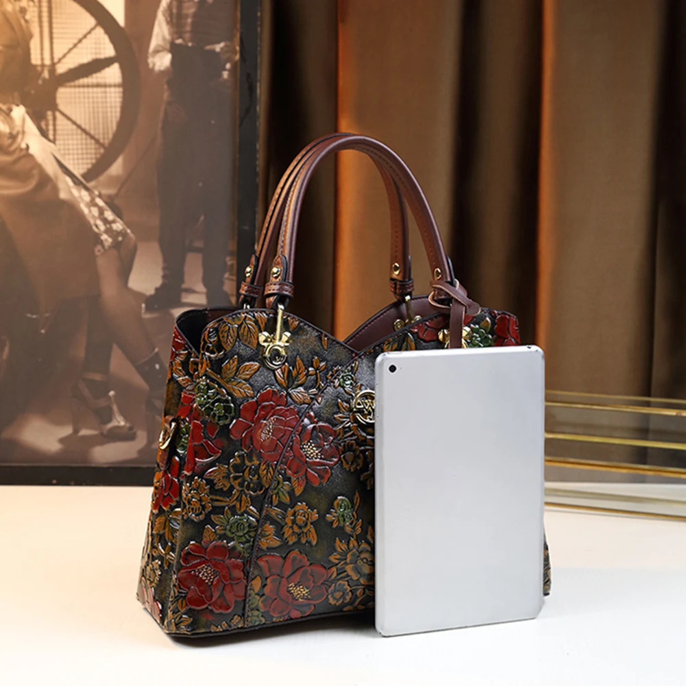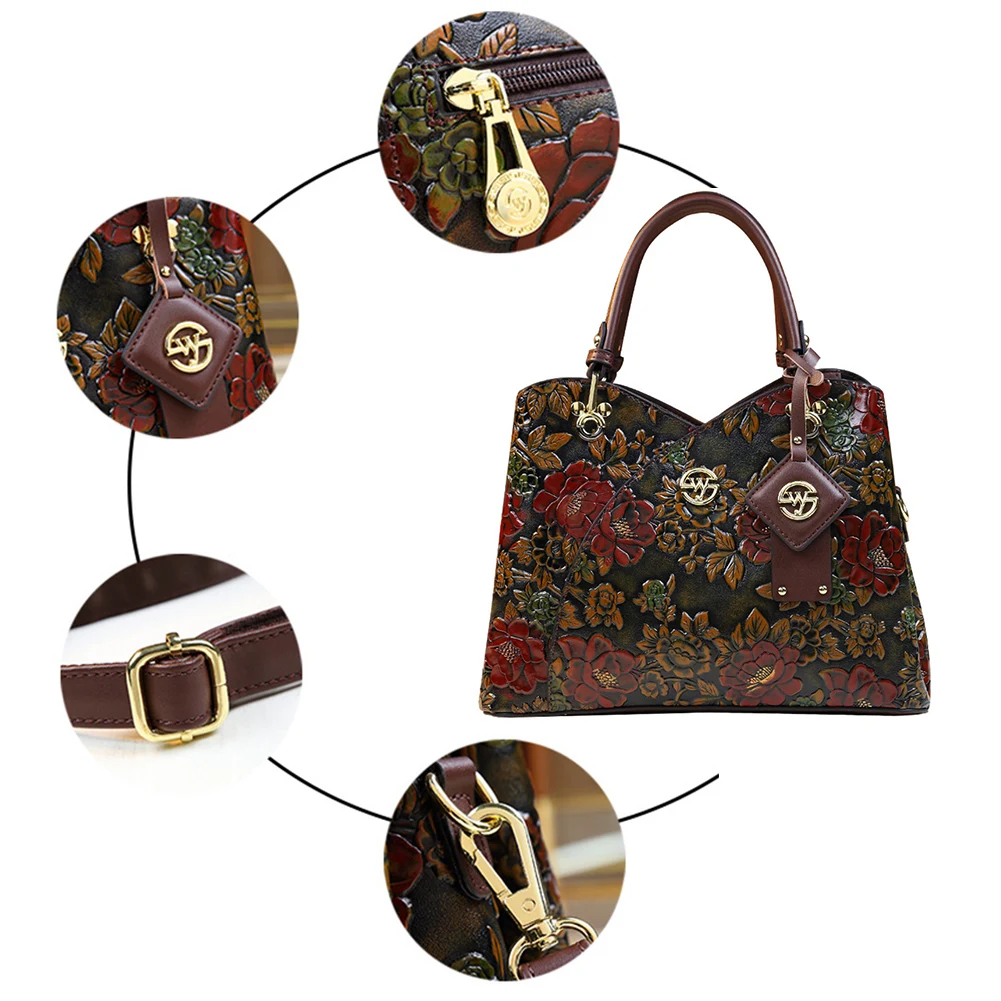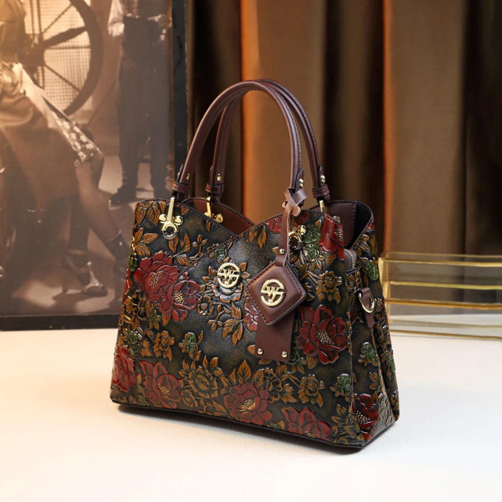 Women Flower Leather Middle-aged Mother Bag Adjustable Fashion Crossbody Bag Zipper Closure Carved Retro Handbag Large Capacity for Daily Use Satchel Bag